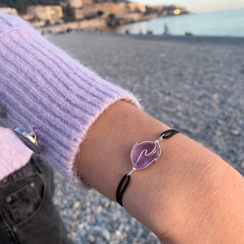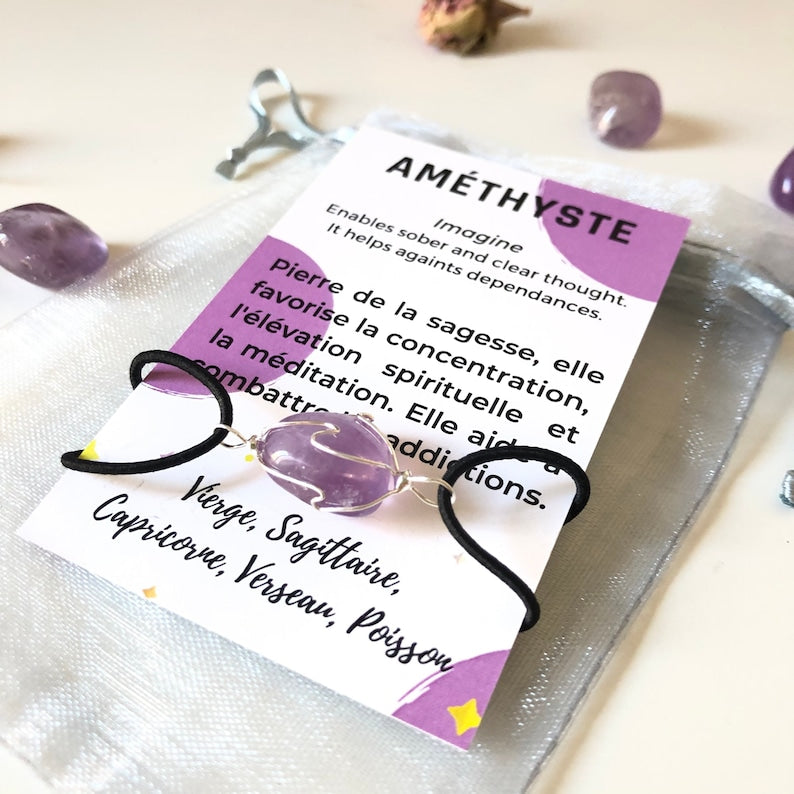 This strap in Amethyst symbolizes peace . It protects the person who has it on their wrist from negative waves . Stone of wisdom , Amethyst, helps to let go and brings inner calm .