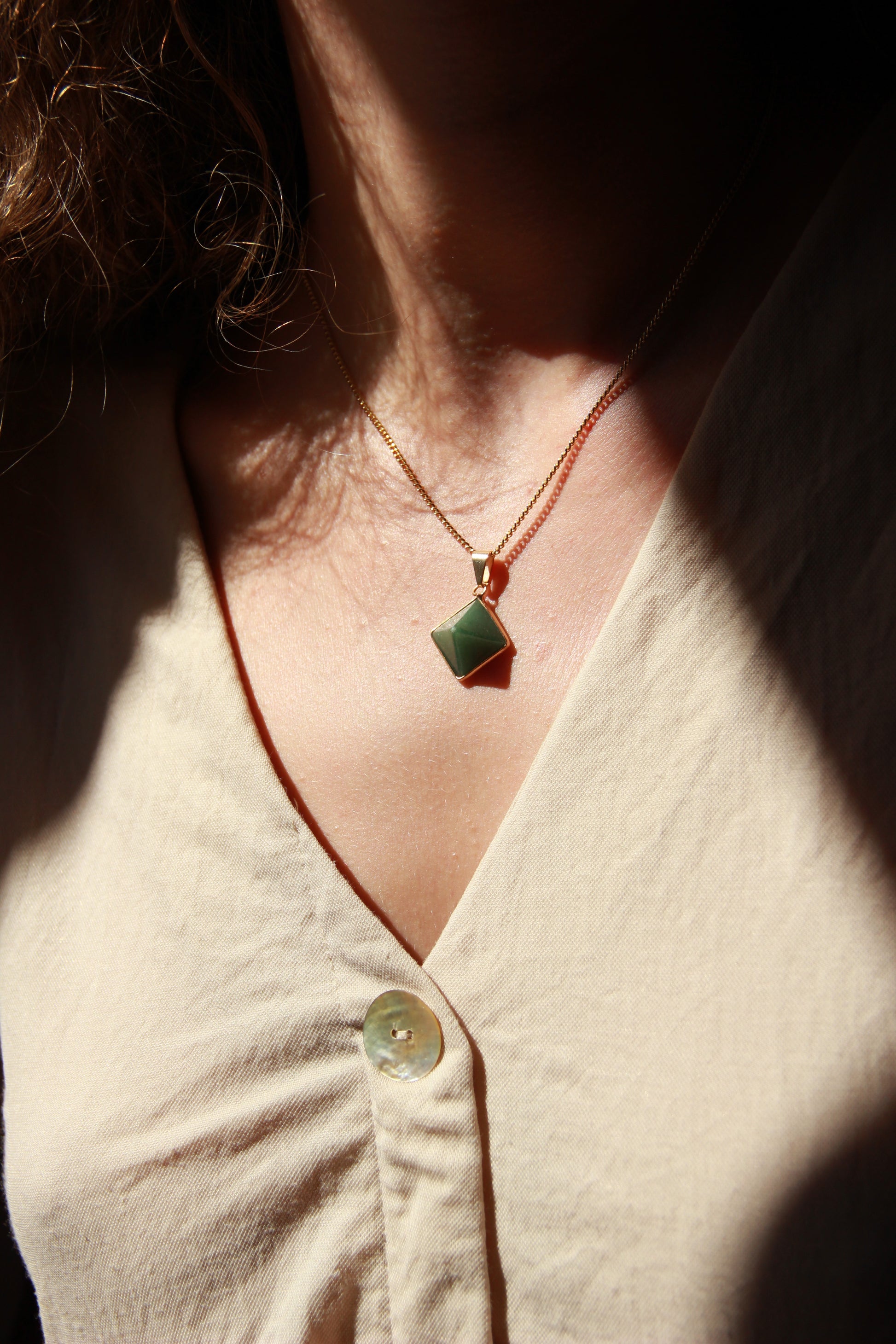 Plongez dans la symbolique de ce pendentif en forme de pyramide en Aventurine. Cette pierre semi précieuse est une source de chance et de prospérité, elle encourage à saisir les opportunités de la vie avec confiance. La pyramide, symbole de stabilité et d'ascension, fusionne avec l'Aventurine pour favoriser la croissance personnelle, la sérénité et la connexion avec la nature