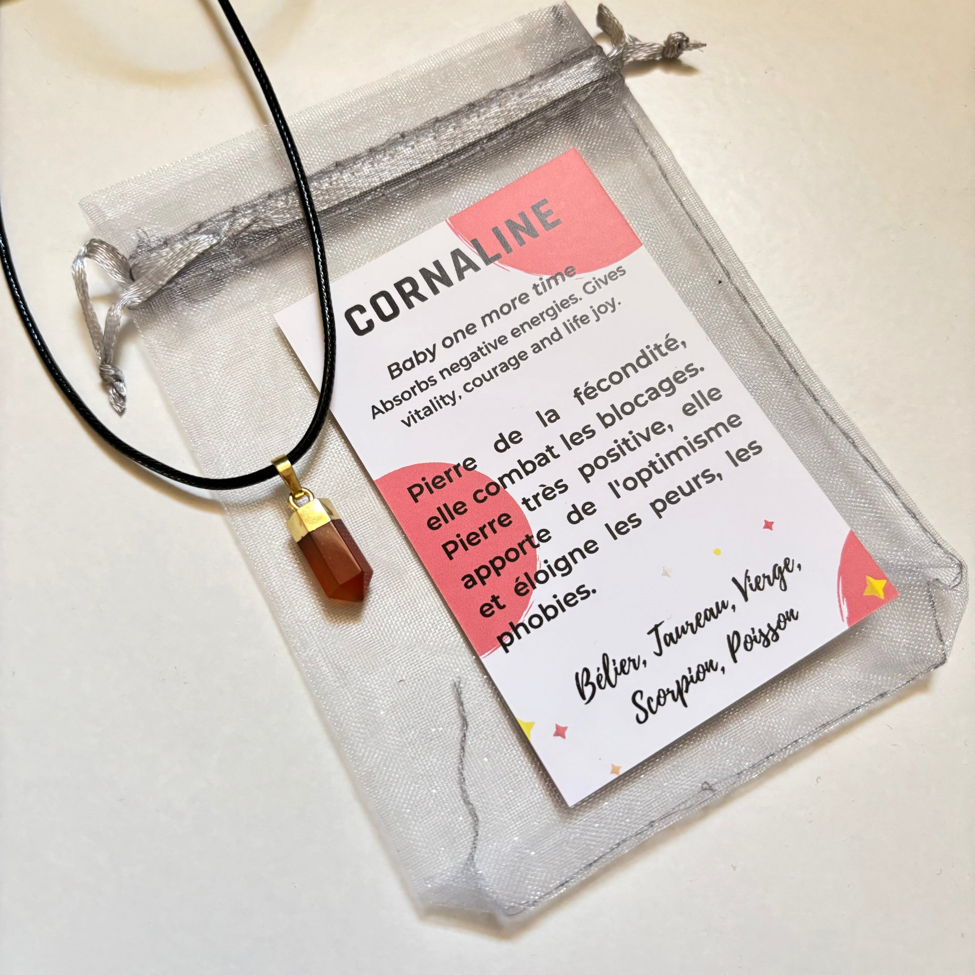 Ce pendentif en Cornaline symbolise la force et le positif. Il libère des blocages, des traumatismes et des peurs. Pierre de feu, la Cornaline augmente le désir, la fertilité et renforce la spontanéité.